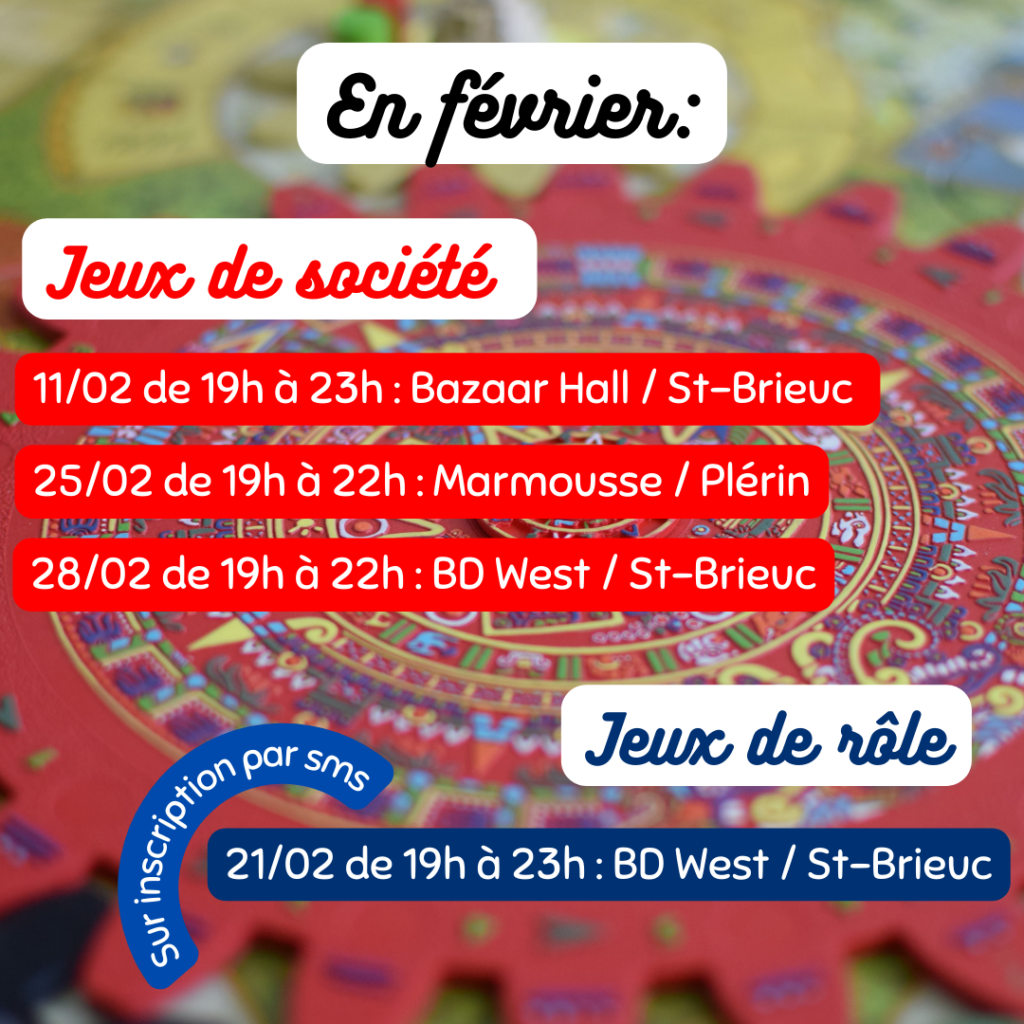 Nous serons également demain, Samedi 24 Janvier, à la bibliothèque de Saint-Brieuc André Malraux, pour une animation / découverte de jeux de sociétés divers et variés, de 17h00 à 20h00 (entrée libre et gratuite)
